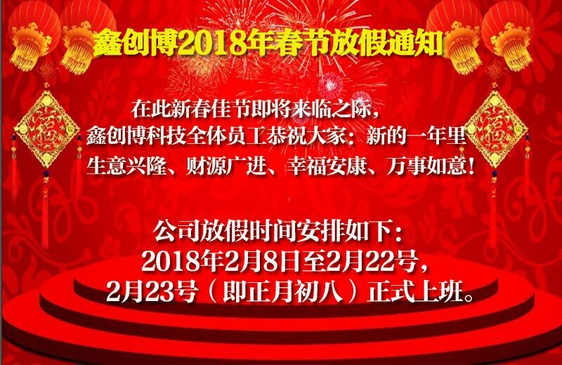 感謝新老客戶對公司的大力支持,公司于2018.2.8-2.22日放假,2.23正式上班,放假期