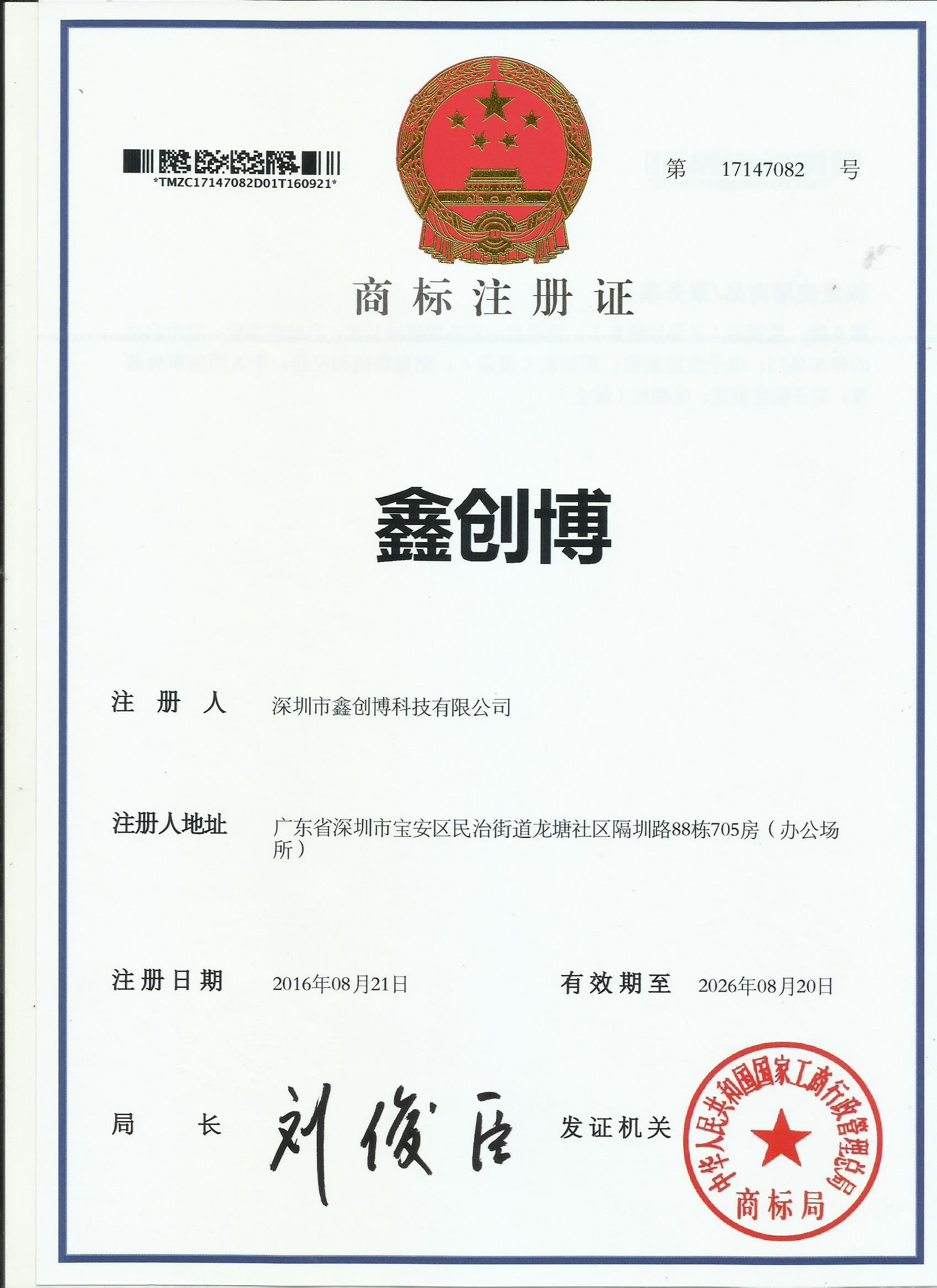 摘要: 歷時請近兩年的“鑫創博”商標注冊證書于昨日由國家商標總局頒發并郵寄到公司,代